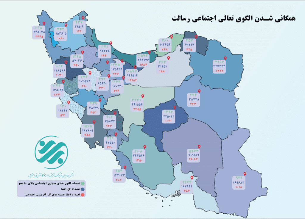 در شکل زیر میتوان تکثر جمعهای مردمی شکل گرفته در سراسر کشور، به تفکیک تعداد اعضا، تعداد کانونهای همیاری اجتماعی و تعداد هستههای کارآفرینی اجتماعی را مشاهده کرد.